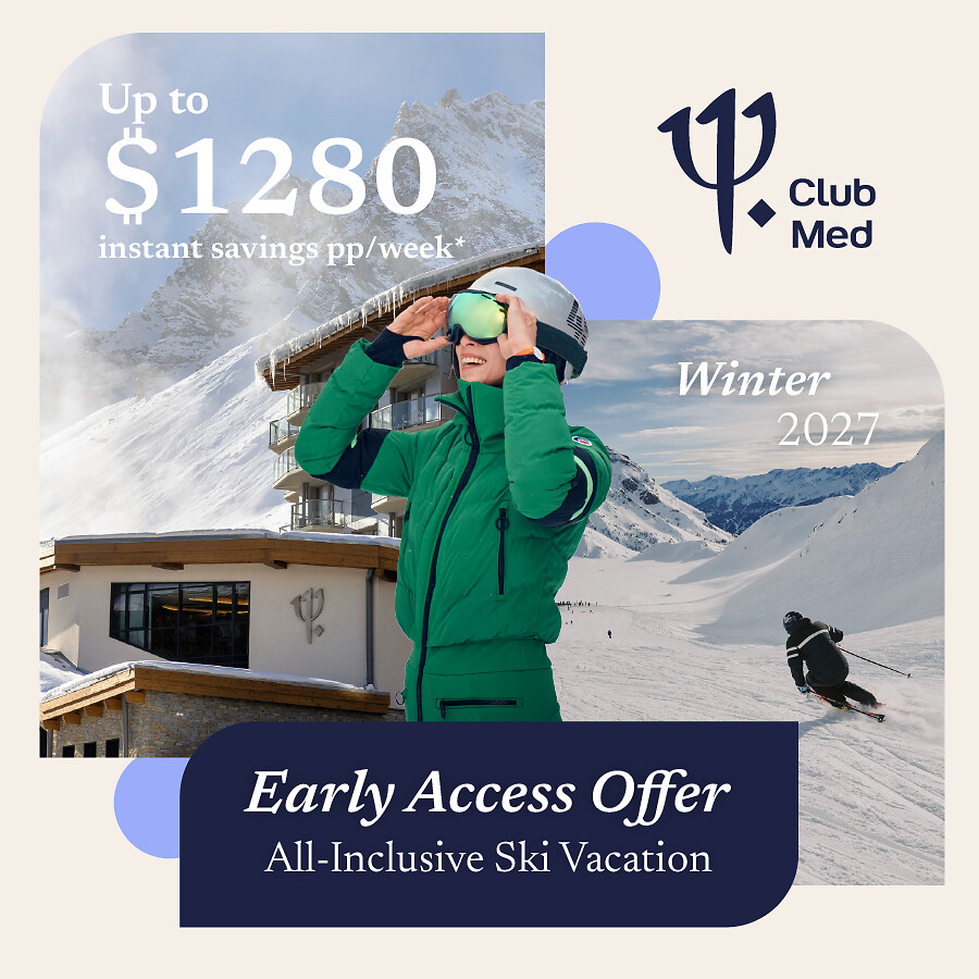*Instant savings up to $1280pp/week: Sample discount applies to the standard rate based on double occupancy in a Deluxe or Suite category room for a 7-night stay at Club Med resorts in the Alps. Discount may vary depending on travel dates, room categories and resorts. The minimum length of stay required to book in one of the resort in the Alps varies between 1 to 7 nights depending on resorts and dates. This offer does not include airfare. Valid for new individual bookings only for select travel dates with check-in on or after November 22, 2026 and check-out on or May 1, 2027. Must be booked between February 3-6, 2026. Offer is subject to capacity control and may increase at any time or be withdrawn at any time.
