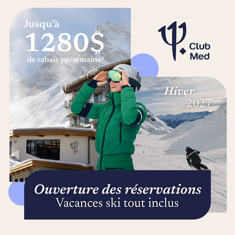 *Jusqu'à 1280$ de rabais sur votre sejour par personne/semaine : Le rabais indiqué s'applique au tarif standard basé sur une occupation double dans une chambre de catégorie Deluxe ou Suite pour un séjour de 7 nuits dans les Villages Club Med dans les Alpes. La réduction peut varier en fonction des dates de voyage, des catégories de chambres et des Villages. La durée minimale du séjour requise pour réserver dans l'un des Club Med dans les Alpes varie de 1 à 7 nuits selon les Villages et les dates. Ne comprend pas le billet d'avion. Valable uniquement pour les nouvelles réservations individuelles pour des dates de voyage sélectionnées avec une arrivée à partir du 22 novembre 2026 et un départ jusqu'au 1er mai 2027 . Doit être réservé entre le 3 et le 6 février 2026. L'offre est soumise à un contrôle de capacité et peut augmenter à tout moment ou être retirée à tout moment.