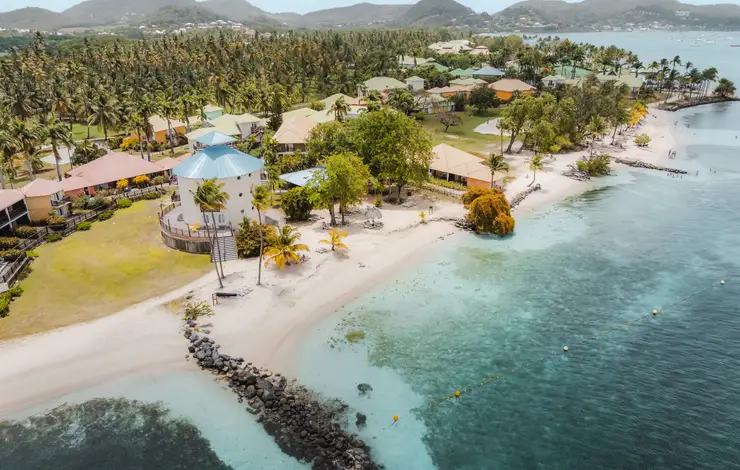 Face au rocher du Diamant, le Village s’étire sous les cocotiers, bordé par les eaux turquoises et le sable blanc des Caraïbes